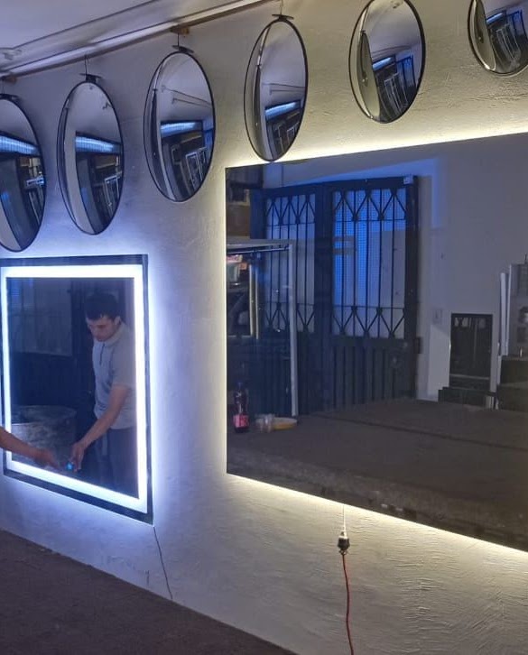 Suministramos e instalamos diámetros en espejo biselados, pulidos y brillados, de colores, sandblasting y con luz led.